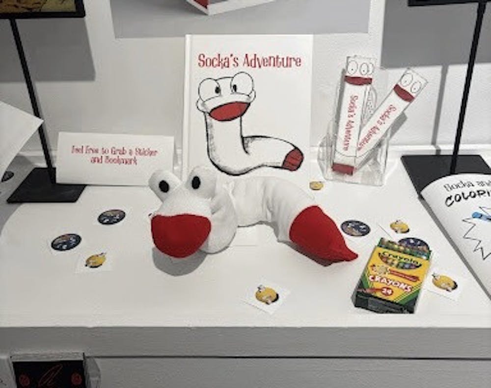 Socka’s Adventure features a friendly sock puppet story, Rivera’s showcase also including free stickers and bookmarks based on his character. (Photo by Ashley Ragone)